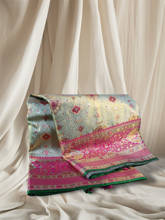 Exquisite Green & Pink Kanchi Silk Saree with Intricate Gold and Floral Motifs