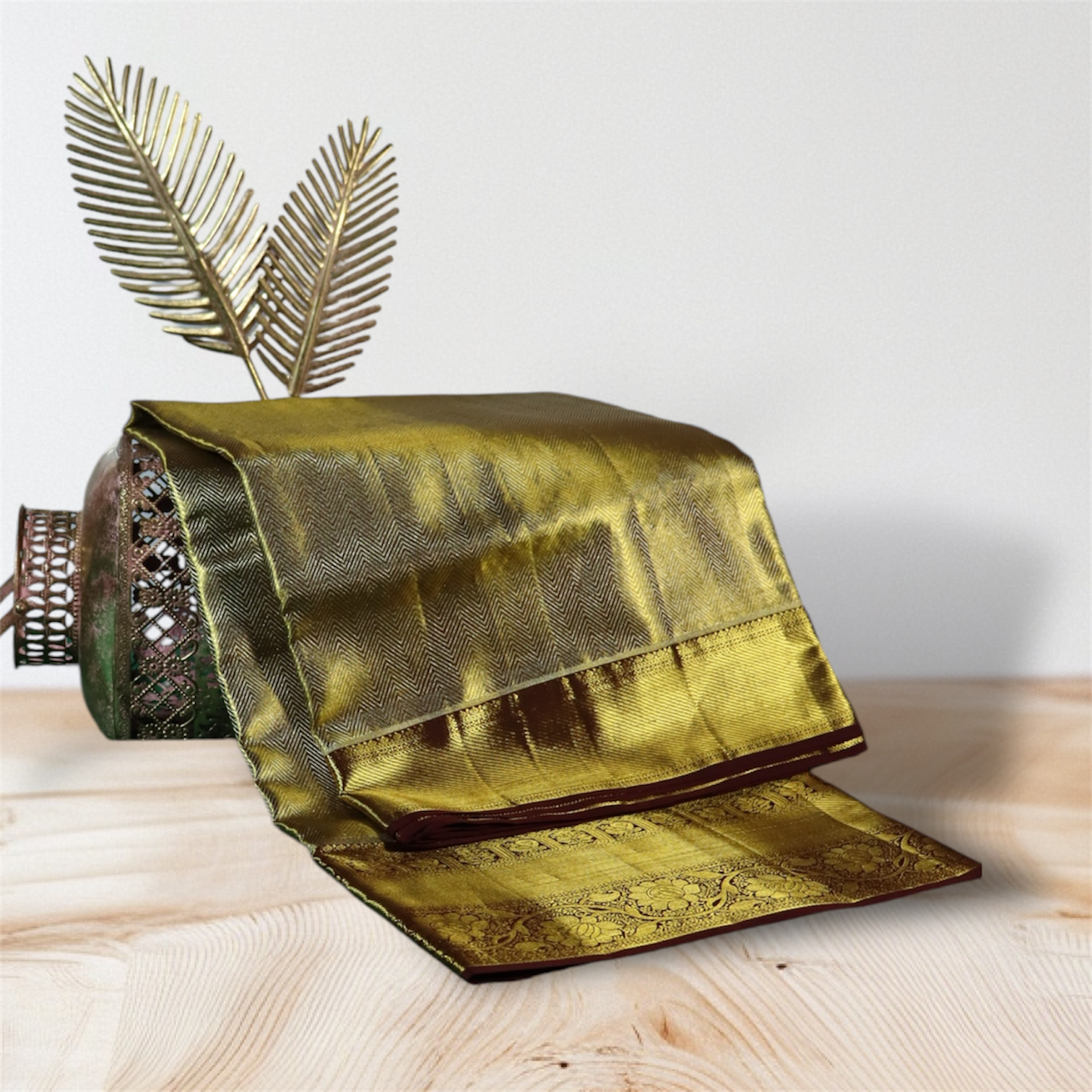 Step into timeless elegance with this luxurious Kanchi silk saree, crafted in a stunning combination of gold and brown. Made from the finest silk, the saree boasts a subtle herringbone pattern that adds depth and texture to the design. The border features intricate traditional motifs, adding to its regal appeal, while the deep brown edging provides a rich contrast that enhances the overall opulence of the saree.