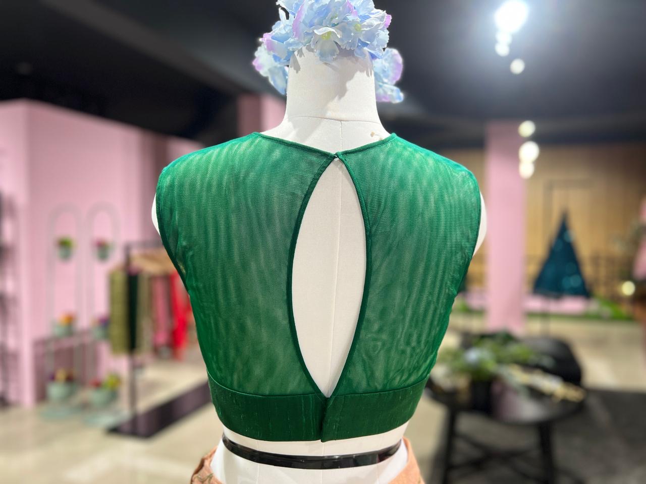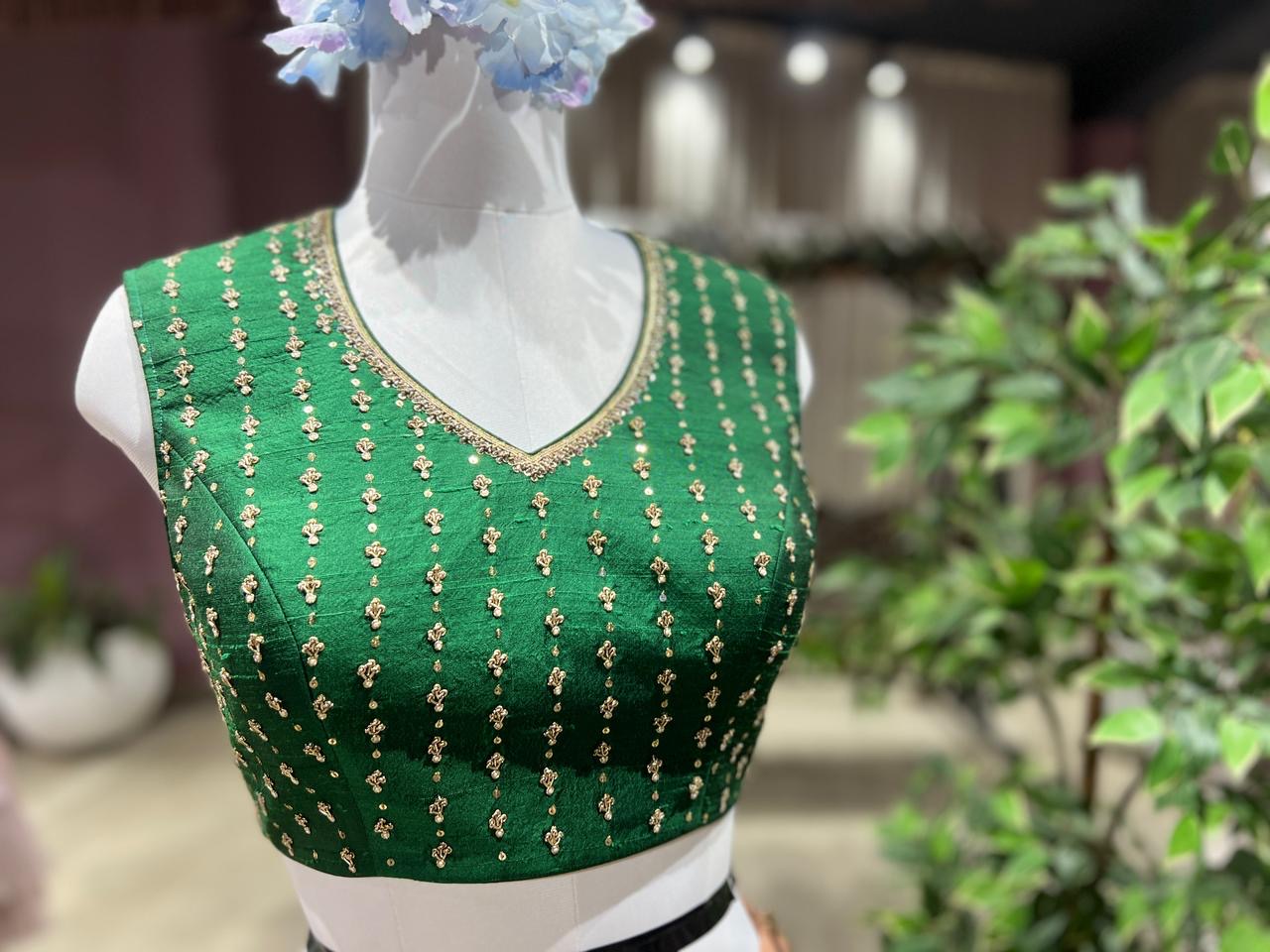 - Blouse: Deep green raw silk blouse featuring vertical mirrorwork lines for a slimming effect, finished with a subtle V-neck.
