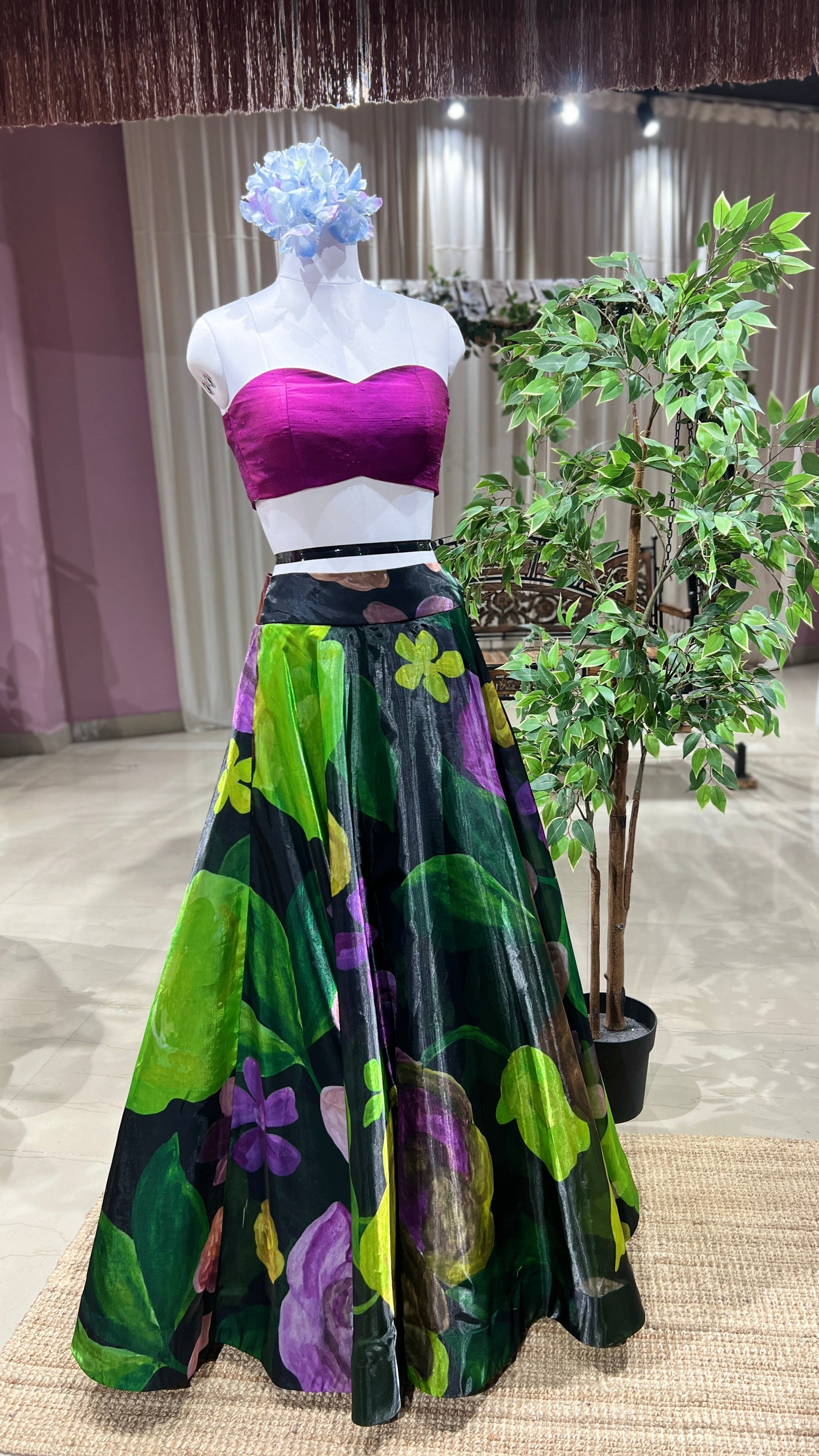 Midnight Bloom – Bold Organza Lehenga with Wine Raw Silk Blouse
