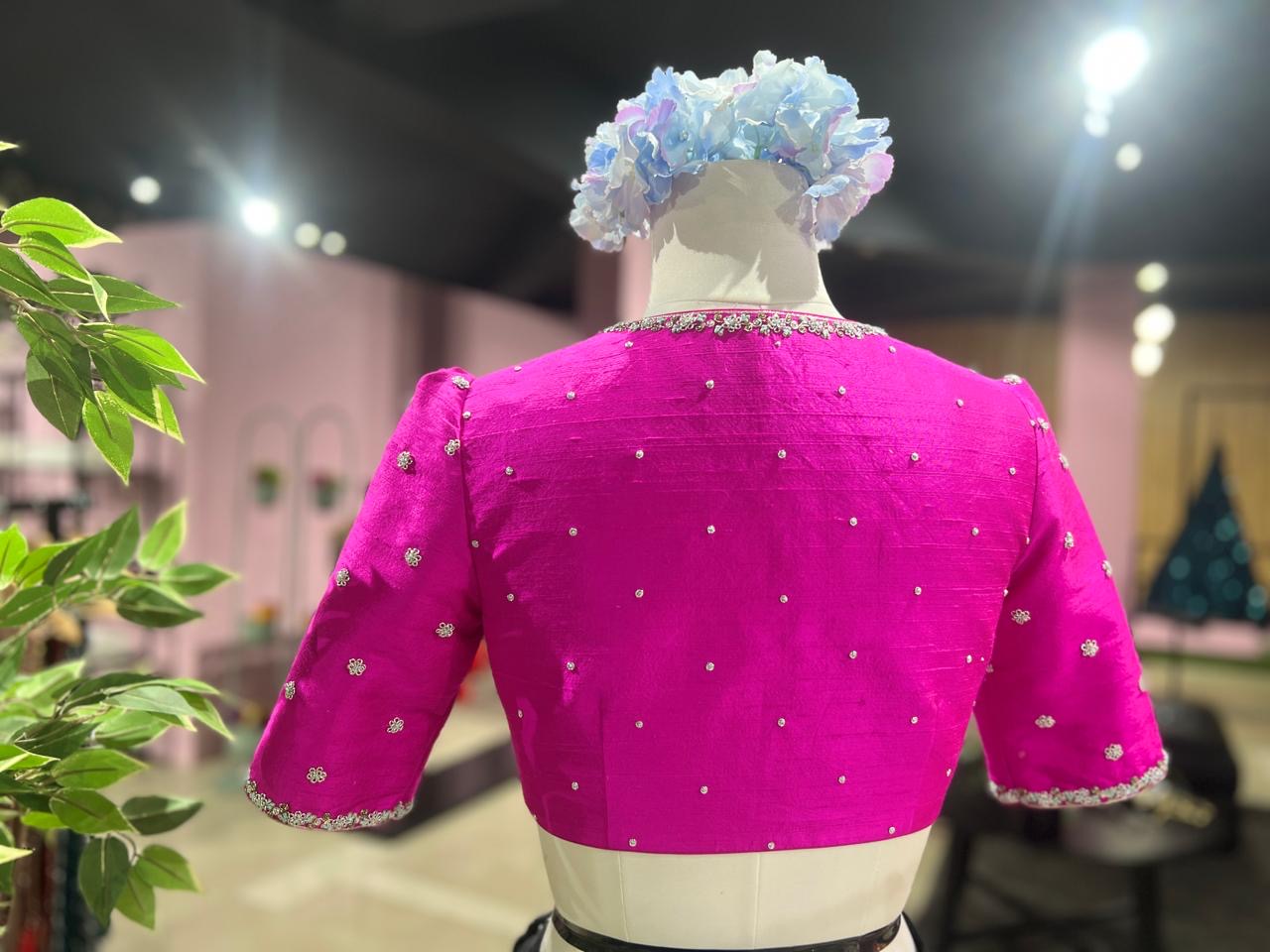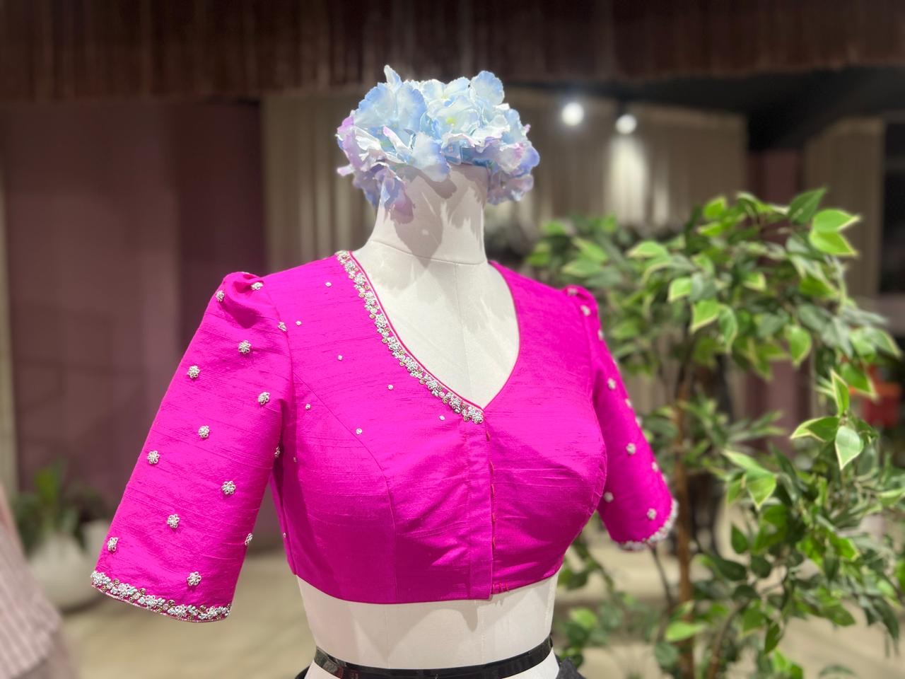 • Blouse: Contrasting fuchsia raw silk blouse with hand-done mirror work and structured tailoring for a sharp, festive silhouette.