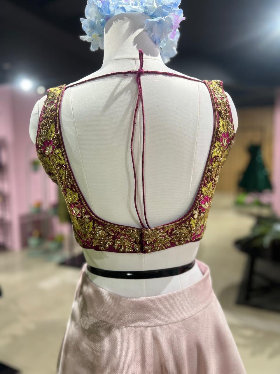 - Blouse: Hand-embroidered Raw Silk in wine and gold tones