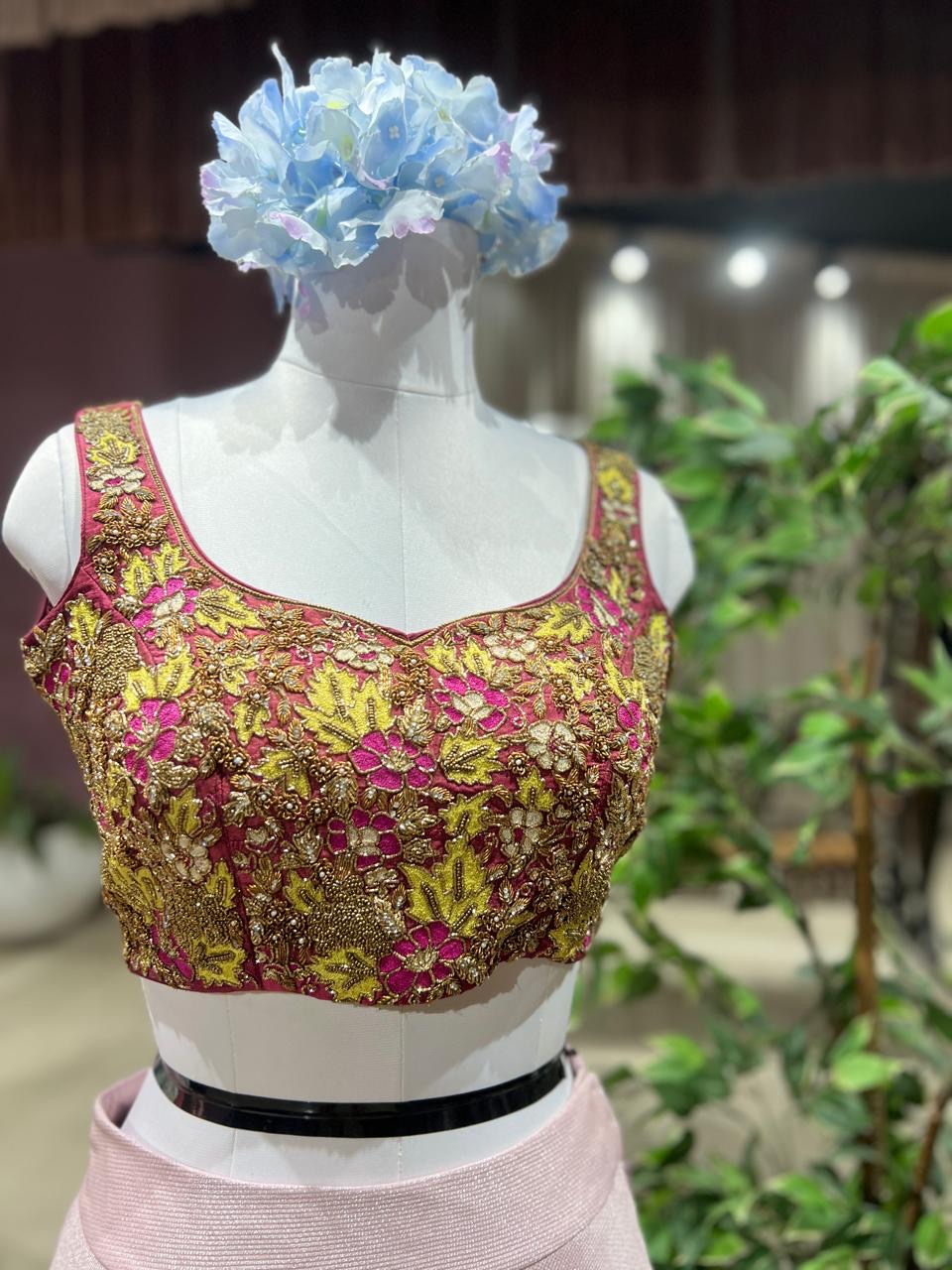 - Lehenga: Shimmer Jacquard in blush pink with minimal hem