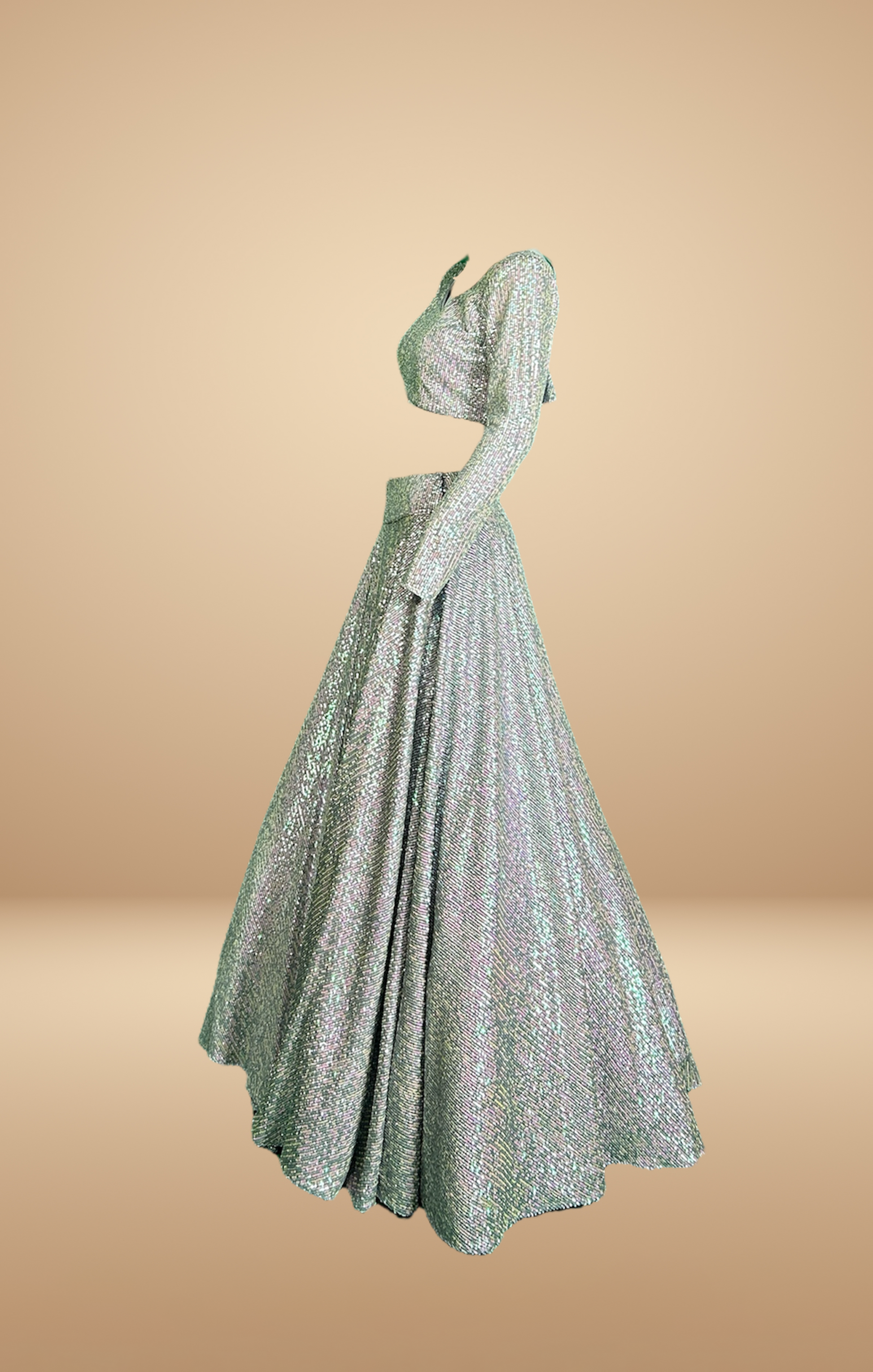 Description: Elevate your evening wardrobe with this stunning Shimmering Silver Sequin Dress. This dress features a beautifully crafted silver sequin top with a round neckline and long sleeves, paired with a matching full-length, flowing skirt. Perfect for formal events, galas, and special occasions, this dress will make you sparkle and shine with elegance and sophistication.