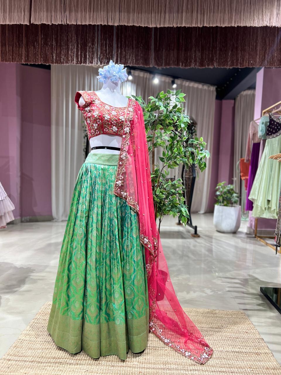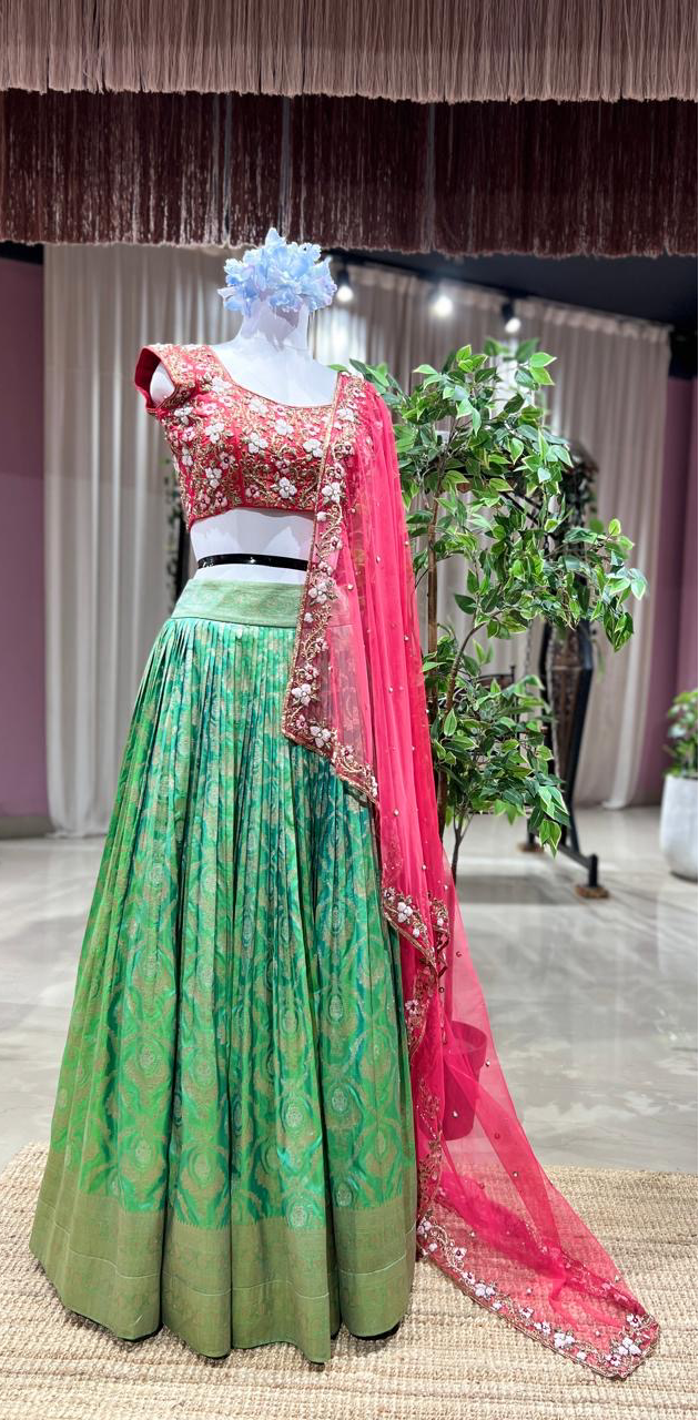 Step into the spotlight in this radiant ensemble that balances elegance and tradition. The emerald green Banarasi lehenga offers timeless luxury, while the statement blouse brings a pop of contrast with its intricate embellishment. The sheer pink dupatta adds a dreamy flow, completing the look with a touch of celebration sparkle.