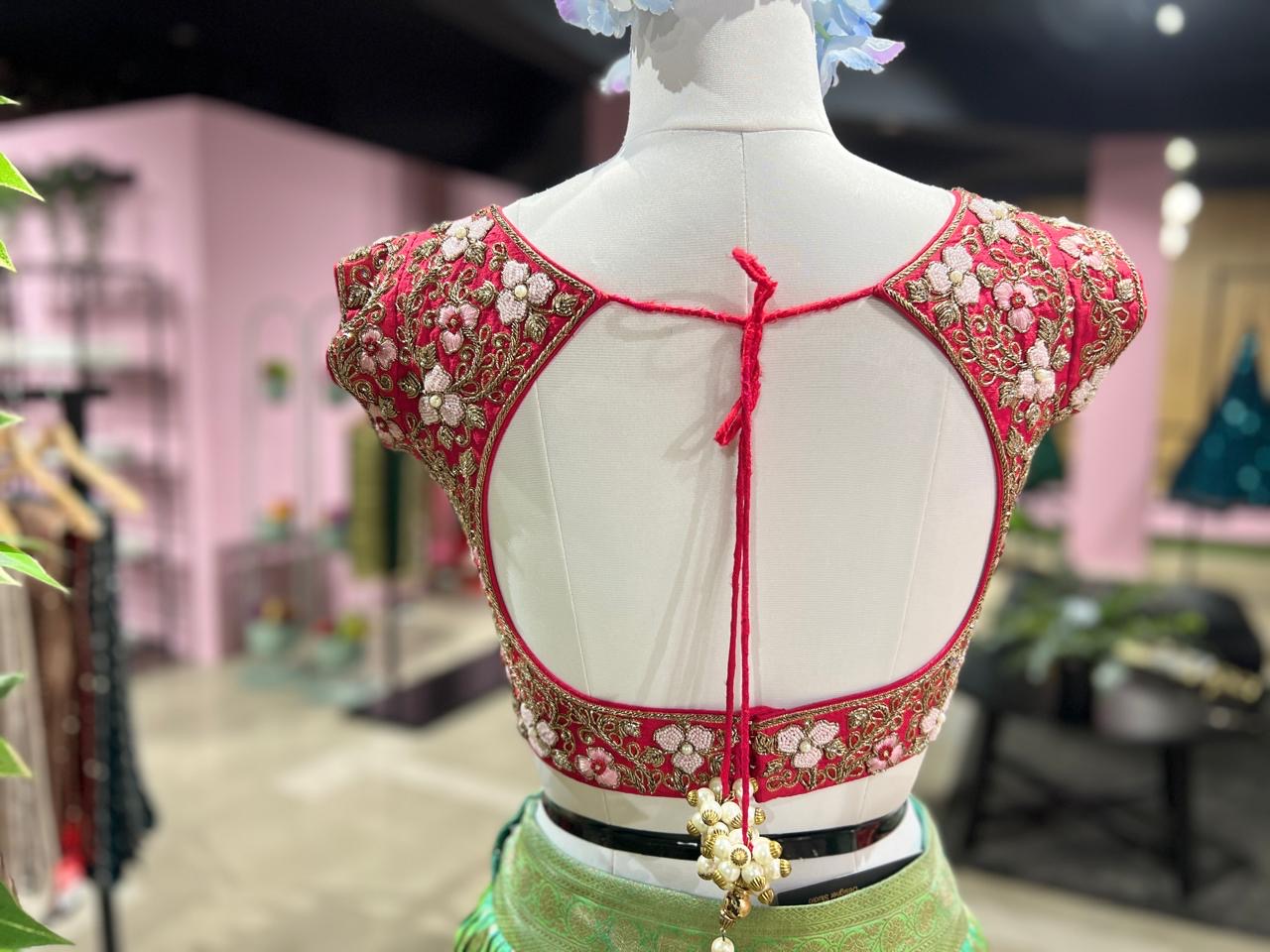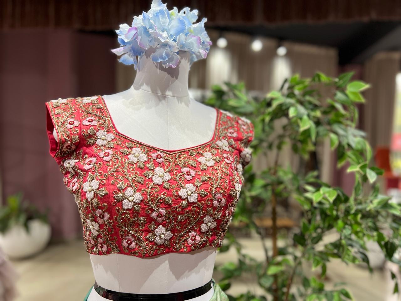 • Blouse: Deep red raw silk blouse, hand-embroidered with floral patterns and mirror work
